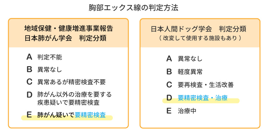 肺がん学会の判定では、がん検診としてはEが要精密検査となります。