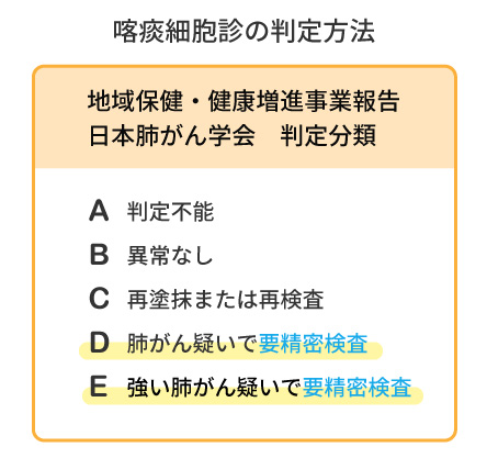 喀痰細胞診の判定方法は基本1種類です。喀痰細胞診においてはDとEが要精密検査となります。