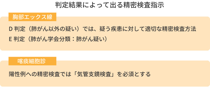 また、判定結果によっては以下のような精密検査の指示が出ます。 胸部エックス線のE判定では、CTが望ましいことが多いですが、現状では明確に指定していません。